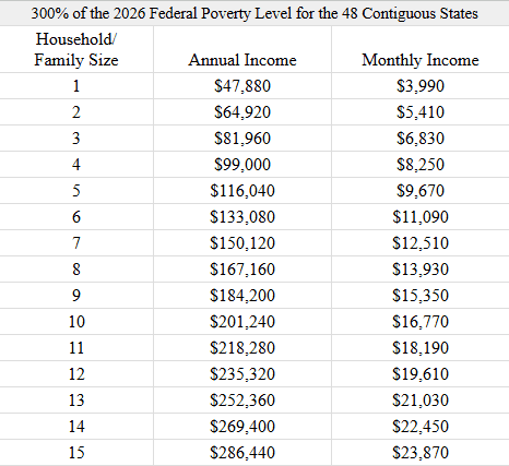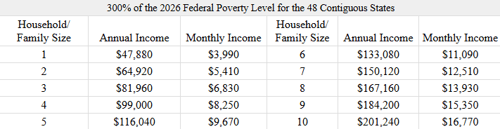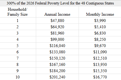 2) Total household income must be below 300% of poverty level.