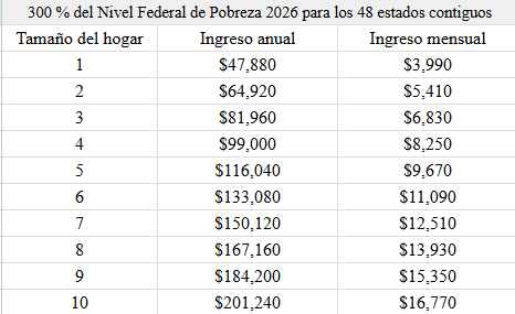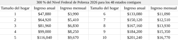 2) El ingreso total del hogar debe estar por debajo del 300 % del nivel de pobreza.